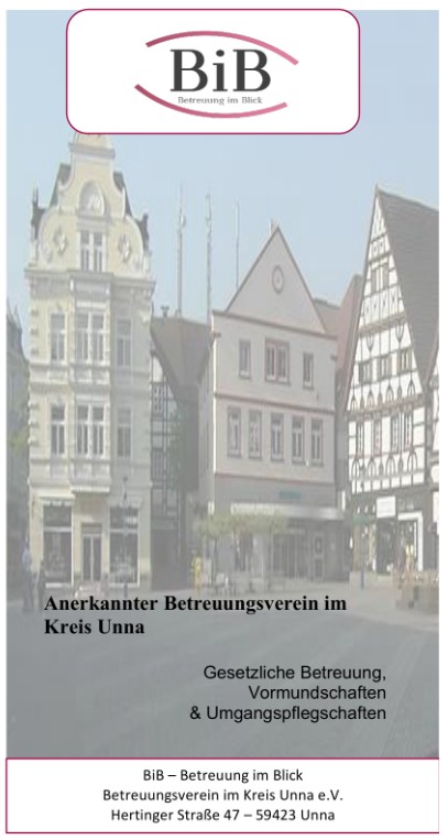 Der Betreuungsverein „BiB – Betreuung im Blick e.V.“ ist im Januar 2020 gegründet worden. Als Zusammenschluss von Fachkräften aus den Bereichen der gesetzlichen Betreuung, der Vormundschaften und der Kinder- und Jugendhilfe bieten wir im Kreis Unna ein menschennahes Angebot und Leistungsspektrum an, bei dem der Mensch und seine individuellen Bedürfnisse im Mittelpunkt stehen.